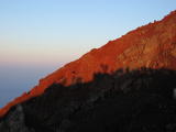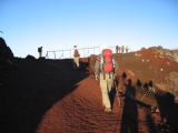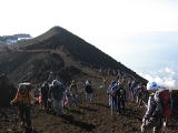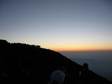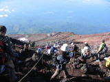 | ☆ ☆ ☆ 九.五合目まで来ました。先が見えてきましたが、ここからは大渋滞です。 日の出には十分間に合う予定でしたが、思うように進みません。 ☆ 途中で空が白んで来ました。もしかしてご来光には間に合わないかも? 誰もがそう思っていたみたい。後ろの人は道を外れて追い越していきます。 ☆ ☆ ☆ |
