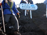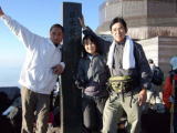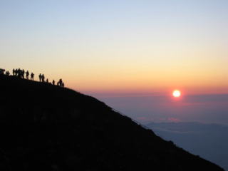 | 富士宮口五合目登山口22:30〜六合目22:53-23:00〜新七合目23:55〜七合目14日1:00〜八合目2:20〜九合目3:15〜 九合目五勺4:05〜山頂4:50−ご来光4:57−最高峰剣が峰5:40−朝食出発7:00〜九合目五勺7:35〜九合目8:05〜 八合目8:45〜七合目9:20〜六合目10:35〜五合目登山口10:45 ☆ |