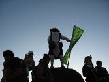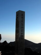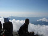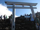 | ☆ ☆ ☆ 鳥居をくぐり、やっと山頂に着きました。人がとても多いです。みんなご来光を楽しみにしているのですね。 見えそうな場所を探したけど、小さいわたしには人影で見えそうもありません。 スパ様がこちらで見えると呼びに来てくれました。 急いで付いて行くと、右手は気をつけないと落ちてしまいそうな特等席です。 立っていると危ないので座って日が昇るのを待ちます。雲の間からお日様が見えてきました。 そして徐々に雲の上に現れてきます。神秘的で綺麗なご来光です。 山頂を踏めたのも嬉しいけど、ご来光に間に合って良かった。 そして特等席に案内していただいたスパ様に感謝です。 ☆ ご来光を見たのでチョット一休みです。 ふと見るとのぼりを持ったチョット変わった方を発見。 岩の上ででんと構え、どこからわいてきたのか不思議です。 ☆ ☆ ☆ |