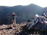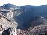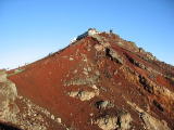 | ☆ ☆ ☆ 食事も済み下山の準備をします。見上げると、剣が峰と青空が眩しい。 お鉢を眺めながら鳥居へと向かいます。なんちゃんはお疲れモードたっぷりみたい。手前でチョット一休み。 ☆ ☆ ☆ |