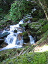 | ☆ ☆ ☆ ナメ滝まで来ました。水源地まで約半分ですね。このあたりはお花はほとんどありません。 キノコは多いのですが、食べられるか分からないので素通りします。 ☆ 苔むした原生林がとても綺麗です。それと小滝もなかなか良いです。 暑い日だったようですが、涼しい風が吹いてきて気持ちよいです。沢沿い歩きの特権ですね♪ ☆ ☆ ☆ |