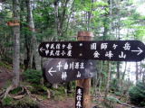 | ☆ ☆ ☆ 苔が目に優しくてとても綺麗です。水源地まで着きました。 ここまで約3時間、登り通しよりは楽ですが、意外に疲れるかな〜 ここで湧き水で汗ばんだ手を洗います。冷たくてとても気持ちよいです。 手ですくって飲んでみます。チョット渋みって言うのかな、そんな味がしますが冷たくて美味しい。 ☆ ペットボトルに湧き水を詰め山頂を目指します。 ここから山頂までは1時間弱で着きます。所が分岐点までの20分が急坂できついです。 途中何回休んだかな〜。分岐点に着きました。 ここから国師ヶ岳や金峰も行けますがコースタイムを見ると国師ヶ岳まで5時間近くかかるのですね。 ☆ ☆ ☆ |