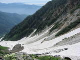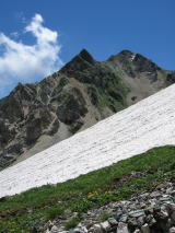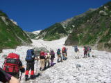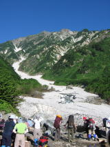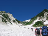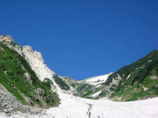 ここから見える大雪渓は壮大です。青空と白い雪、久しぶりに晴天の登山になりそう。