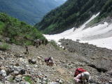 リーダーさんが駆けつけ、歩けるまで待っていることにします。 他のグループでも、バスで隣だったAさんが雪渓の途中で足がつれていたみたい。