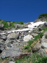 雪渓を30分ほど登ったあたりは前方も後方も良い眺めです。道をよけて撮影タイムです。 更に登っていくとピンクのお花が見えました。