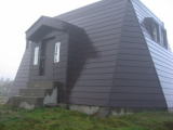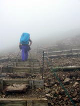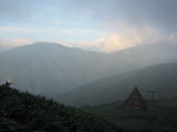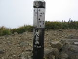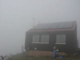 長い階段を登って行くと、肩の小屋に着きました。ここもガスっています。