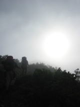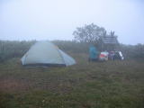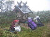 | ☆ ☆ ☆ 軽く食事をとりテントを撤収します。露で湿っているため、昨日よりも重くなったようです。 お水を補給してから出発します。ガスがかかっているので、今日も眺めは期待できないかも? ☆ ☆ ☆ |