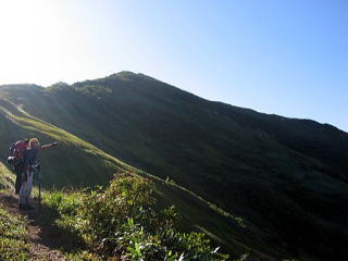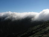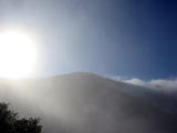 | ☆ ☆ ☆ 前方は霧がかかり様子がわかりませんが、心なしか明るくなって来ました。 シルエットで見える太陽が幻想的ね。と眺めていたら、みるみる青空が広がって来ました。 わぁ〜 凄いのね。これから登る朝日岳がはっきりと見えてきました。 振り返ると、泊まった清水峠が見えます。昨日歩いた谷川岳方面も雲の上に頭を出しています。 反対側には、巻機山・目の前の山からは滝雲も見えます。凄い〜感激〜〜。 ☆ ☆ ☆ |
