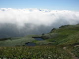 | ☆ ☆ ☆ テント場に咲いていたお花をパチリ。途中で見かけたお花をパチリ♪ 池ノ窪に着きました。イワショウブが沢山咲いて綺麗です。 ここで朝日岳方面が見えるらしいのですが、このお天気ではチョット残念です。 でも見えたらあそこまで登らないとで、引いてしまうかもしれないらしいです。 見えても見えなくても、良いほうに取りたいものです。 ☆ ☆ ☆ |