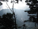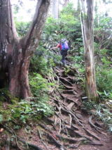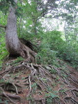 | ☆ ☆ ☆ ひたすら下ること?時間。タラタラのセンが見えてきました。 大分降りてきたけど、まだまだです。それに暑さで体から顔まで熱くなってます。 風がほしい。休憩していると、こちらは涼しいと聞こえたので移動します。 太い木の根にまたがり、ふと上を見ると谷川岳も見えました。 ☆ ☆ ☆ |