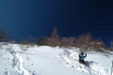 | ☆ ☆ ☆ 支度をしリフト(500円)に乗ります。登山者8人がリフトに乗るのは、スキーヤーにとって違和感が あるかもしれませんね。リフトに乗っていても寒くなくスノーシュー日和みたい♪ ☆ 降りた先でスノーシューを装着します。歩いていくと雪の表面がキラキラととても綺麗です。 ツツジ平から遠くに雪山が見えます。雪の量が少ないのかツツジの枝が所々に飛び出しています。 ☆ 風見鶏のある場所で一休みします。ここから山頂が見えますが時々雪煙も見えます。 これは風が吹いている目安になるみたい。寒いのかな〜 ☆ ☆ ☆ |