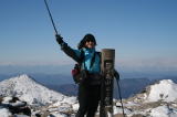 | ☆ ☆ ☆ 写真を撮りながらルンルンと登っていくと山頂に到着。ビュービューと風が容赦なく吹き付けてきます。 三角点までよろよろしながらタッチし、山頂(^^)vを試みます。 立って居られません。山頂標につかまりながら撮っていただき退散します。 ☆ ☆ ☆ |