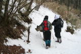 | ☆ ☆ ☆ なんちゃんと合流後、相模湖インターを出てすぐ近くのコンビニでえーちゃんと待ち合わせをします。 えーちゃんは、集合前に神の川駐車場の下見に行ってきたとの事。お疲れ様。 現地の状態は、昨年の台風9号の爪痕が修復されて無く手前1qから歩かないとの話になりました。 普通に歩いてもぎりぎりのタイムになるので、わたしが一昨年登ったコースに変更します。 ☆ 青根から林道へ入りますが、雪が残っています。行ける所までと進んでいくと、轍が凍っているような気配… しかも坂でカーブ。ゆっくりと進んでいくとツツーとあらまぁ、まずい(^^;; 車から降りたらツルリ&尻餅。これは滑るわぁ〜と枯れ葉やら土を掘ってタイヤ付近に蒔いたり 色々と試みました。タイヤは言うことを聞きませんねぇ。バックするわけにもいかず、かなり悩みました。 最後にえーちゃんが持ってきたタオルが活躍し。救出劇はなんとかクリアー。良かったよかった♪ ☆ ☆ ☆ |