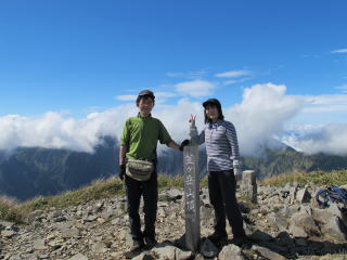 | ☆ ☆ ☆ 見た目通り登り返しがキツイわぁ。お花はないし…でも朝日岳の斜面が見えたときはプチ感激です だって左斜面が紅葉しているので♪ ☆ 笠ヶ岳頂上に到着しました。いつもは三角点に直ぐタッチするのに、先に朝日岳を見てしまった ☆ ☆ ☆ |