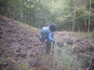 | ☆ ☆ ☆ 見上げると岩ごろの斜面です。浮石は苦手だわ〜と付いていきます ☆ ☆ ☆ |