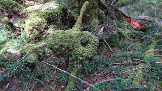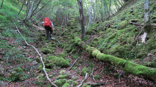 | ☆ ☆ ☆ 唯一眺めがあったのでそこで一休み。先を見ると苔むした石もあります 人が歩いていないので、大きい岩でもズリッと動きます。これが体力を消耗しとても疲れます だんだん登りがきつくなって嫌になる。でも登らないと一般道につかないし、頑張ろうと心でつぶやく なかなか進まないので、亀じゃなくてナメクジ歩きですねぇ ☆ ☆ ☆ |