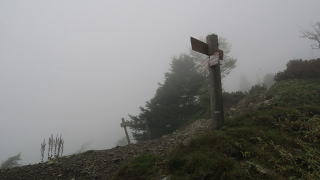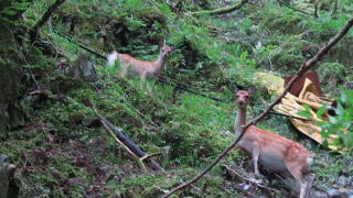 | ☆ ☆ ☆ 戻る途中、ガレ場の上でガラガラと。。。そちらを見ると鹿の親子でした。見つめるだけで逃げないね。 小屋付近でポツポツきたのでカッパを着ないとかな〜と迷いましたが、樹林の中を歩くので止めました。 着たら暑いしね。雁坂峠もガスっているのですぐ下山します ☆ ☆ ☆ |