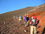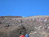 | ☆ ☆ ☆ 前日pm9時秩父を出発、富士山五合目の駐車場は満車の為、1q下の駐車場から歩き始めました。 0時00分でした。ヘッドライトが前や後ろに見えました。見上げれば満天の星空、\(・o・)/ワア!吸い込まれそう。 暗いため何処を歩いてるのか検討もつきません。山小屋の明かりに向かってました。 八合目、ここから山頂まで3時間の文字が目に入りました。わぁ〜まだまだ遠いなぁ〜。 しばらくすると徐々に東の空が明るくなりました。ご来光です。その瞬間歓声や柏手が聞こえました。 明るくなってきたので、山頂めざしてゴーです。所が、徐々に気分がすぐれなくなってきました。 歩こうと思っても体が言うことを利かなくなってきました。山頂まであと30分だけどリタイア…またトライですね。 ☆コースタイム9時間☆ |